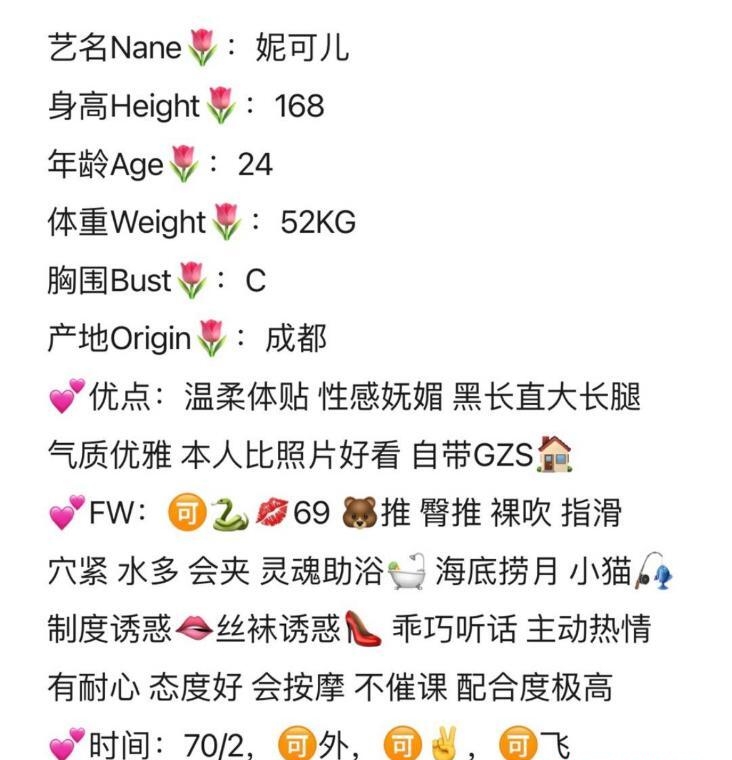 这个妹子在南京干了挺久了,在论坛也挺出名,南京的老狼们应该都知道她,天花板级别的服务还带着一对D胸,纹着个花臂韵味十足,服务的时候配合着暗暗的灯光和骚气十足的音乐,一个字,绝。没试过的兄弟们一定要去体验一把她的臀推。经常被封号要抓紧,春节期间也在岗