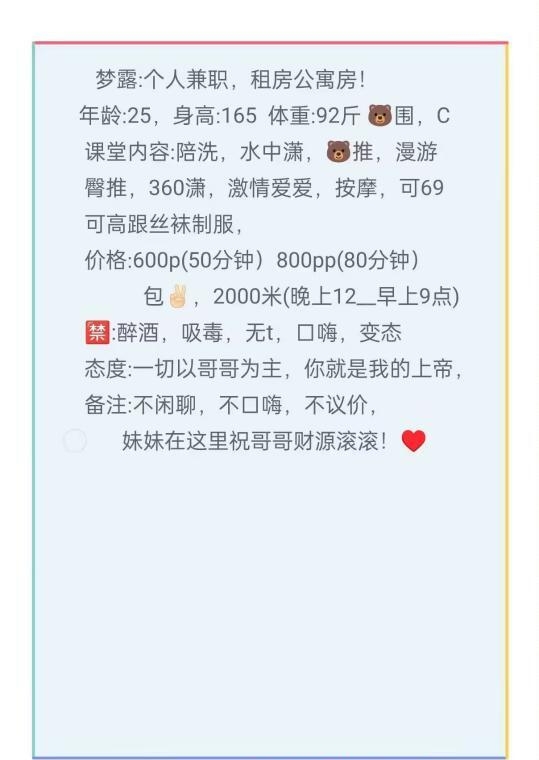 喜欢年轻的不要去 熟女类型 平时上班 有空才兼职 要提前预约。进门就给你一个拥抱 然后带你洗澡 洗的时候还给你吹两下 有点av的画面感。洗完就拉你到床上做服务了 毒龙很舒服 吹箫你不叫停不会停。本狼差点没忍住吹出来。赶紧戴套一阵抽插出水 买单。价格是300一次400两次。只有微信没留电话