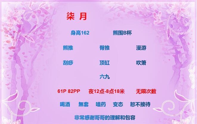 说说这妹子的优点:第一,长得没话说,年轻,好看,照片就是本人,第二,妹子身材比例好,没有小肚子,身材好,最重要的是,看着瘦瘦的,屁股还很有肉,后入真的爽,第三,大家都做过过水吸皮,但是妹子的过水吸皮,漫游是我做过最好的,主要是舌头很软很灵巧;小黄文不表,去过的兄弟都是一致好评,这次去的兄弟验证过记得来回复一下;为啥一定要帮这个妹子推呢,我问妹子要不要涨个价,因为她确实不止这个价,妹子说不涨,就这个价钱,在这个肉价飞涨的年代,我主动问起的时候,还能这样,所以我还是主动过来给妹子发一发,提前约,妹子回头客很多;照片就是本人,妹子也包夜,包夜需要提前预约。