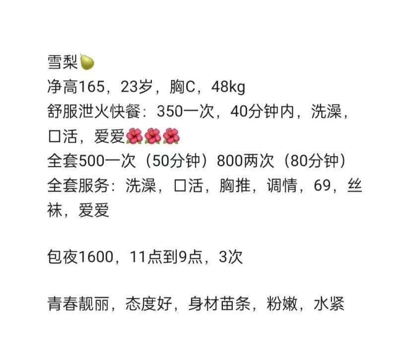 妹子是正儿八经会玩,最开始收费600的,生意不好现在400了,进门妹子打扮的很精致,基本服务,口,69丝袜高跟,架不住妹子好看,大长腿,很瘦,胸一个手握住正好,跟自己女朋友做爱一样,情绪价值拉满,还可以用手扣,反食好多次了,各位狼友可以无脑冲,绝对年轻漂亮,空间有课表和本人视频