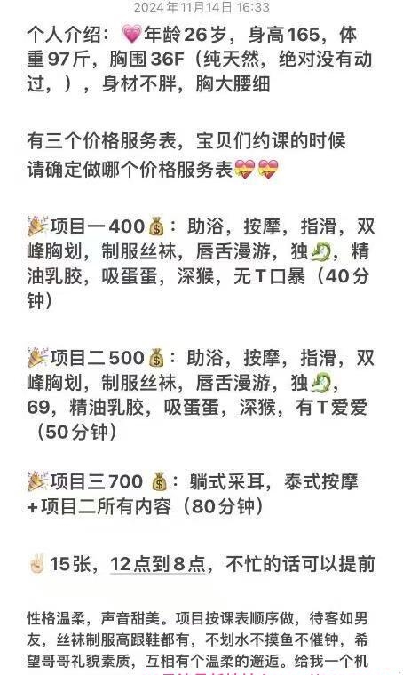 之前在平台上看到的,已经去刷过几次了。小姐姐超级的温柔贴心,人美声甜,服务也特别好。当然,最主要的还是胸大,胸型也很好看,又大又软又挺。体重不超过100斤,属于童颜巨乳类型的。洗澡会主动帮你洗,帮你擦身体,上床先给你来个按摩,小姐姐的调情技术特别棒,指划让我全身起鸡皮疙瘩,大胸在我身上游来游去,还会舔我耳朵,吹气。一套服务做完,牛子都会流好多水。小姐姐做爱的时候叫的特别浪荡,销魂,会主动叫老公,下面紧致水也特别多,会主动变换姿势,每次都特别尽兴。