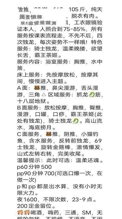 服务项目: 全套ABC面服务 胸推臀推 水中萧 漫游 毒龙 69 抓龙筋 口罐口痧 高山流水 海底捞月 爱爱
