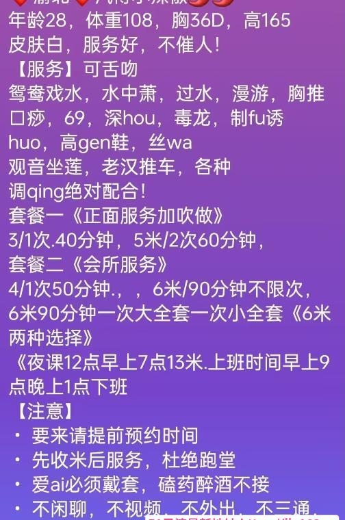 妹子见面人很热情,服务态度也很好,本人比照片更漂亮,皮肤很白,说话给你一种回家的感觉,妹子做服务不催钟,有各种情趣内衣供你选择,胸也很大,属于那种又大又不下垂的奶子,摸着特别爽,服务过程也很细致,先放松,再慢慢丝滑全身,从背舔到pp勾,再是前面,妹子舌头真是厉害,特别是蛋蛋那里,舔的特别仔细,最后后入小狼就忍不住了一泻而下,真是爽歪歪。