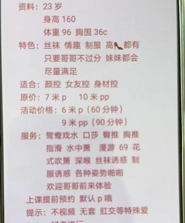 妹子是正儿八经会玩,最开始收费600的,生意不好现在400了,进门妹子打扮的很精致,基本服务,口,69丝袜高跟,架不住妹子好看,大长腿,很瘦,胸一个手握住正好,跟自己女朋友做爱一样,情绪价值拉满,还可以用手扣,反食好多次了,各位狼友可以无脑冲,绝对年轻漂亮,空间有课表和本人视频