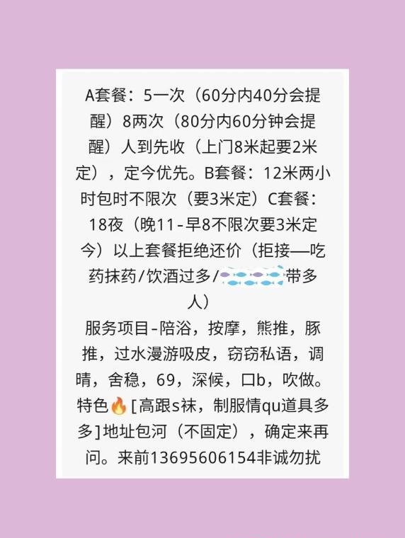 以前找过两次,很热情的老师,主要冲她服务去的,长得还行,但是身材火辣,老师的舌头特别柔软舔的我全身舒舒麻麻的,老师的唇舌毒龙很厉害,我最喜欢的就是这个毒龙,她是做过毒龙技术最好的,口的时候口很深,我是比较难出的,但老师很有耐心,我看她吹的很累都一身汗,不得不说老师是真的很卖力,一点不忽悠,我难出就喜欢做口爆,这样我不累。