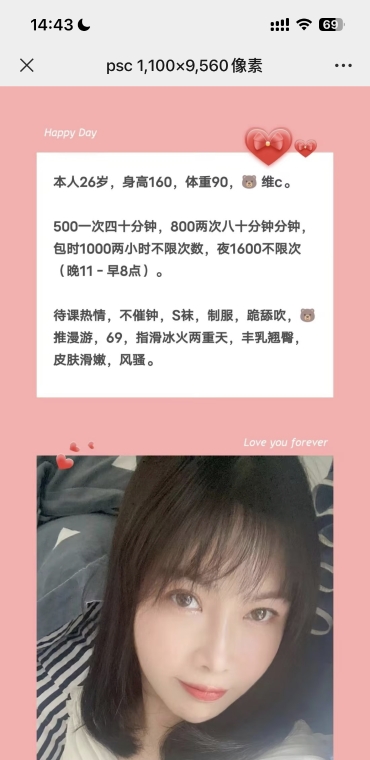 朋友推荐来的,小姐姐遥控上楼,开门看见小姐姐一身性感黑丝。身材超棒,胸大,腰细,腿长,配上高跟鞋太迷人了。小屋很温馨,进门很热情,服务很认真不敷衍,会聊天,性格温柔,颜值高。女上是特色,各种姿势都能配合,情绪价值拉满,各种服务不错舔的我好敏感差点没憋住,最后爱爱。不催人,姿势随便换,水多,会夹,小鲍鱼很粉嫩的,非常漂亮舒服。此刻我己受不了提枪讲入到小穴里一进一出来回的抽插,搞的小姐姐呻吟声不断,最后冲刺结束,带着非常满足感离开,性价比拉满,兄弟们直接冲。