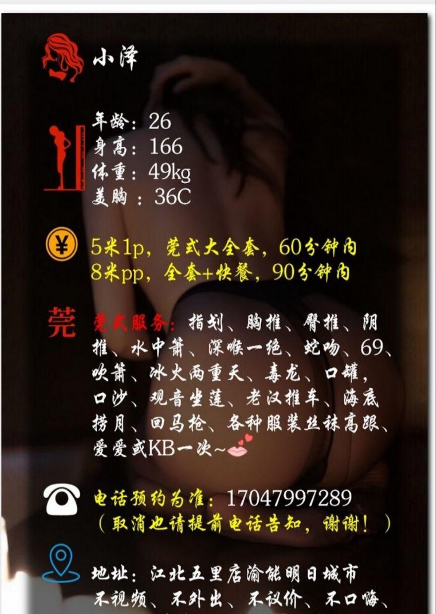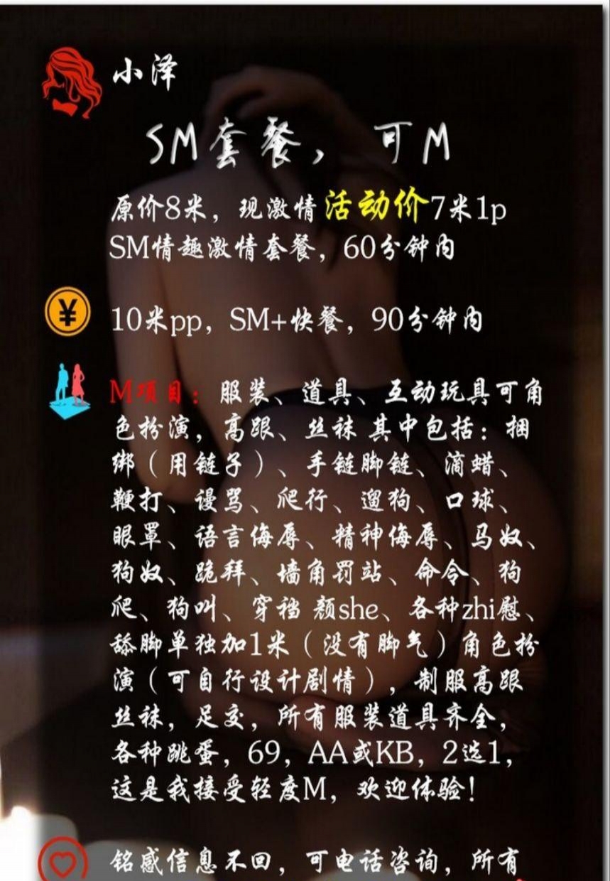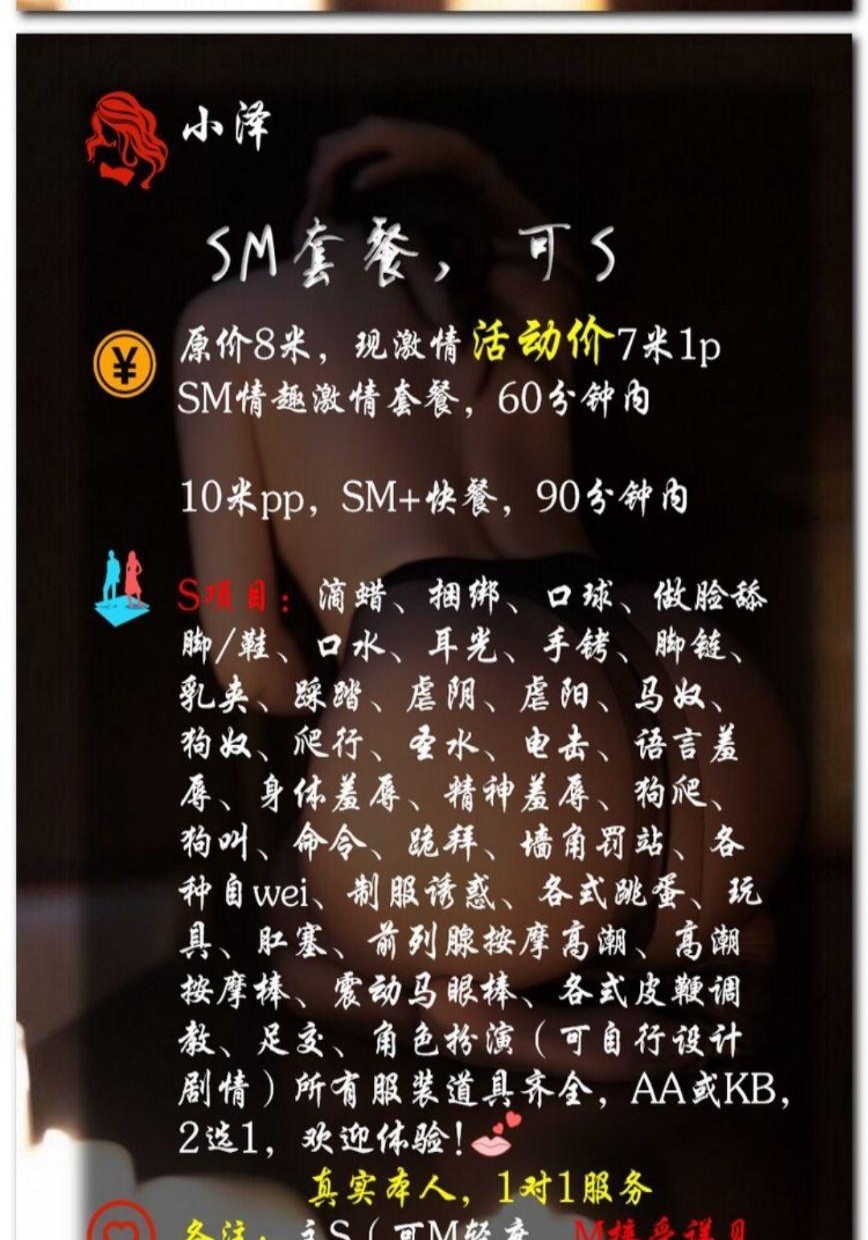 服务项目: SM 可S可M 莞式服务 舌吻 69 各种服装丝袜 角色扮演 足交 回马枪 高跟