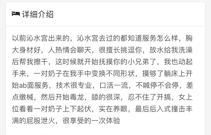 不知道是哪位大神推荐发出来的,说是妹子是以前沁水宫的,服务多好多好,结果去了一探究竟。首先一眼,人照完全两样,颜值和照片差太多(又老又胖),十分熟女,心想熟女就熟女吧,服务好也行啊,本人也是奔着服务去的。结果所谓的AB面服务,也很敷衍了事,绝对没有老牌浴室的服务体验,心情遭上再遭,草草了事,自己踩了雷,要及时发出来提醒各位兄弟们才是,希望各位引以为戒,喜欢熟女且不介意服务的,想去尝试就去吧,言尽于此!