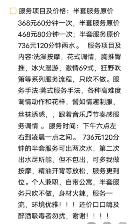 51上面看到的,介绍说服务很好,就加上了联系方式,约了个时间前往,地方还算好找,酒店式公寓,房间干净整洁,放着投影仪,氛围灯,气氛极好。交了水费开始做服务,先洗澡,小姐姐会帮忙搓澡,用的一次性搓澡巾,第一次有人帮搓澡,自己不用动手这种感觉真的超爽的,洗了澡会用一次性浴巾帮忙擦干身体上的水,还帮我用吹风机吹干头发,小姐姐真是细心又温柔。甜甜的笑着,真人比照片感觉更好看,更年轻。吹干头发想着躺在床上,结果小姐姐说不用急,让我站着,然后抱着我来了一段贴贴舞,好妩媚,小弟弟瞬间就梆硬,这种感觉从没有过的,这小姐姐果然有点东西,然后床前调情。躺着AB面调情,难怪那么多人夸,果然服务真的是不错,这服务做的好可比那些快餐什么的有意思多啦,强烈推荐,下次有空必须再来。