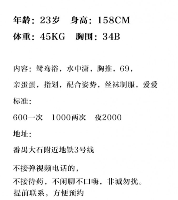 好约,回复及时,位置在地铁口附近,离地铁站走路几分钟。课室很好找,指引清晰,一路都没绕弯。一进门就甜甜地叫“帅哥”,特别热情,先递水照顾得很周到。交水费,有陪浴,全程都保持着微笑,服务态度真的没得挑。还有一次性毛巾和漱口水,细节很到位。她主动换上JK制服和黑丝,视觉冲击直接拉满。口技很不错,舌头灵活地绕着龟头来回舔,带来一阵阵酥麻感。胸很大但奶头小巧,先用舌头和手各玩弄一只,慢慢画圈圈,吮吸轻咬奶头。女上位起手,技术不算特别突出,基本由我来主导节奏,她耳边一直说着骚话,撩得人心痒痒。节奏从慢到快,她在耳边呻吟,听得我只能全程加速。她很会配合轮换姿势,中间女上位时幅度很大,速度也跟得上,换成传教士位,顶得特别深,叫床声音又软又浪,只能默默再加速。双手捏着她的大奶,不断冲击,终于憋不住出水了。