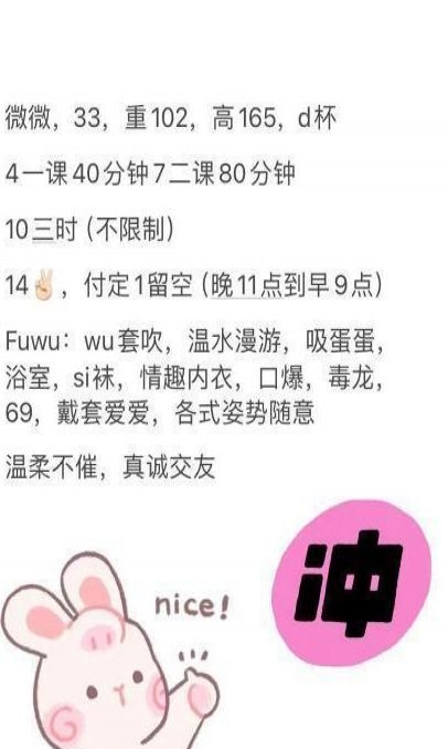年前就加了这位御姐老师,一直没有约上,这看她发圈说新年开课了我果断约了她排课,见到本人颜值真高没什么好犹豫的直接付款留下.我洗澡后她温柔体贴的给我递毛巾递水,开始挑逗我,让我趴着开始背后的服务,胸推漫游吸我蛋蛋,正面69的时候没有任何异味,而且她的下面还挺粉,我是过去其她人从来就用手摸一摸,这次没人能住诱惑吃了两口、做爱的过程中还可以一边舌吻一边做,就像和女朋友一样、交货之后有点意犹未尽,于是我加了400块休息了一会儿做了第二次!总体体验妹妹颜值很高,服务不敷衍,1000块2次、我觉得还是很值得!