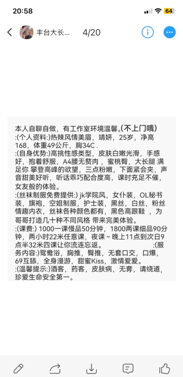 放假期间比较无聊,精虫上脑,加了小姐姐联系方式,小姐姐火速回复,发了照片,看起来应该属于比较温柔的,于是就驱车前往。一进门小姐姐热心帮我脱了外套,先去洗了个澡,随后就正常开始,口活挺好的,尤其是她舌头很软,也比较耐心,做完AB面后,还给做了毒龙,之后后入内射,整个过程约40分钟。只能说性价比比较高,但年龄稍微大了点,应该快40了。