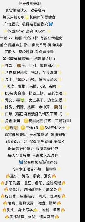 辣辣健身教练,蜜桃臀很大,假期终于约到了一次,大屁股控最爱了,玩了个包时套餐1500玩两个小时随意射,磨棒舒服的射了一次,女上位后入看着那大屁股形变加上小姐姐的叫声,真的太销魂了,有kiss有69、磨棒丝袜,舌吻可以吃个够,单约一次是600,包夜3000。