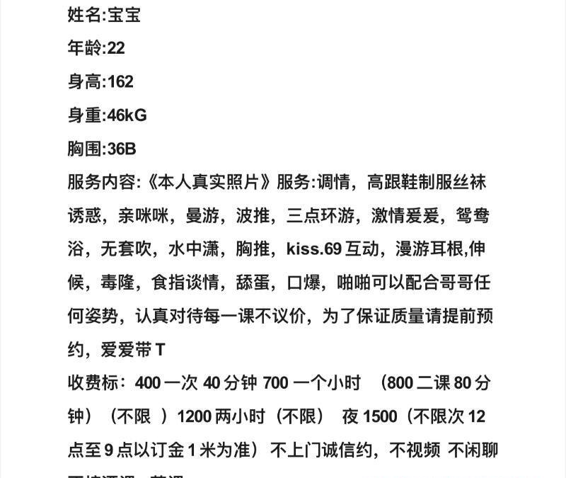 服务项目: 调情 高跟鞋制服丝袜诱惑 亲咪咪 曼游 波推 三点环游 激情爰爰 鸳鸯浴 无套吹 水中潇 胸推 kiss.69互动 漫游耳根 伸候 毒隆 食指谈情 舔蛋 口爆 啪啪
