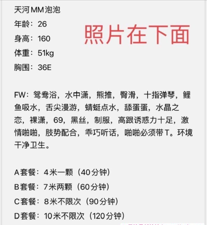 服务项目: 鸳鸯浴 水中箫 熊推 臀滑 舔蛋 69 漫游 制服丝袜
