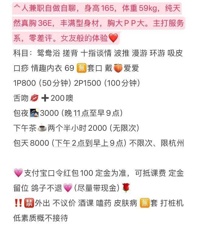 经常约的老师,性格超好,超温柔,健谈不冷场。服务超到位,大长腿配丝袜也是一绝,我每次去都是让她穿着丝袜在上面自己动,老师也是卖力不敷衍,节后也是刚回杭州,喜欢的狼友可以感受下